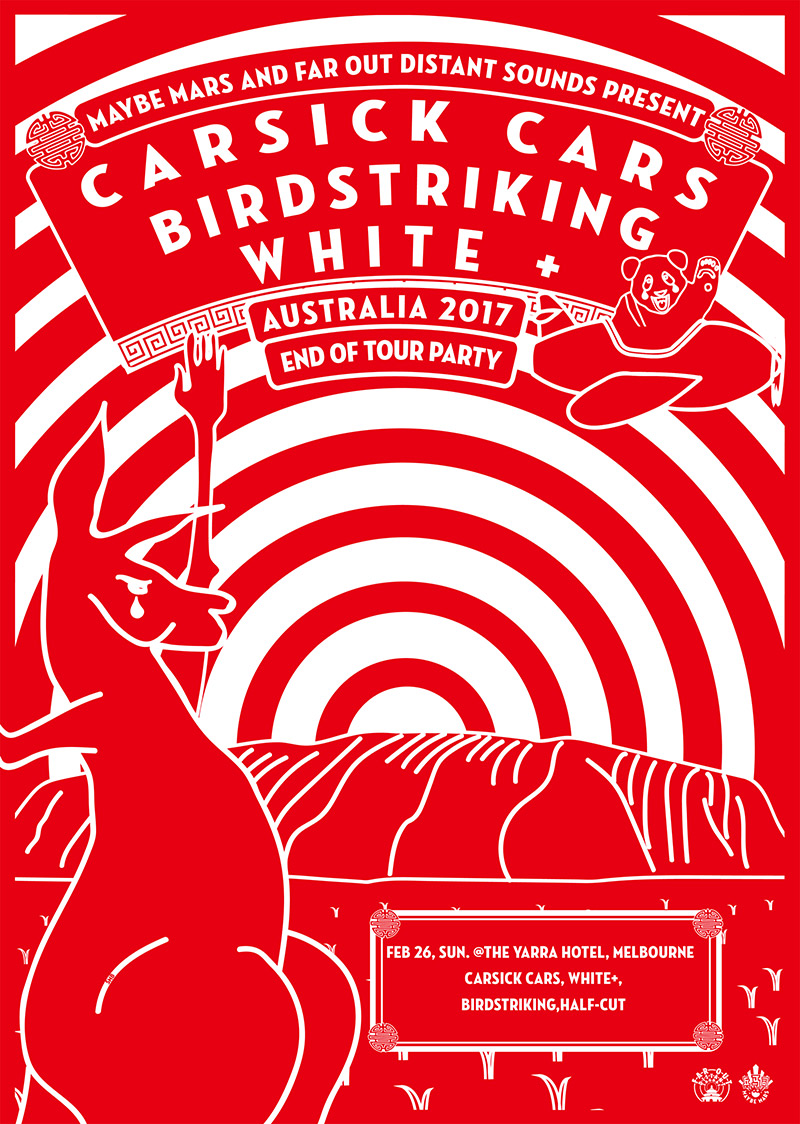 To celebrate the successful completion of our Australia tour we’ve organized one last gig! Come join us on Sunday, February 26 at the Yarra Hotel to catch Carsick Cars, Birdstriking and WHITE+ one last time before they return to the Middle Kingdom.